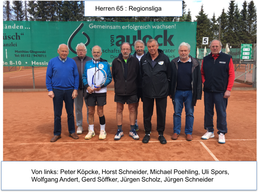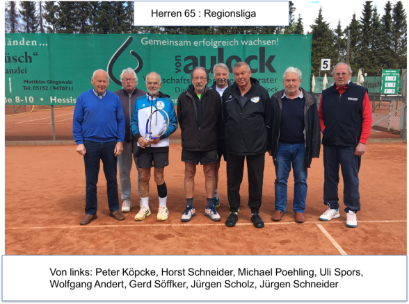 Die Herren 65 waren bis zum letzten Spieltag Tabellenführer ihrer Gruppe aber mit dem abschließenden 2:4 gegen Eimbeckhausen wurde ein Aufstieg noch knapp „verspielt". Dabei war aber auch viel Pech im Spiel, denn mit Uli Spors (verletzt) und Horst Schneider (auf Reisen) fehlten zwei Leistungsträger ausgerechnet in diesem entscheidenden Spiel. Zudem mußte im letzten Doppel auch der sonst sichere Punktelieferant Michael Poehling verletzungsbedingt aufgeben, was wohl ein mögliches Unentschieden kostete. Erfreulich war aber auch in dieser Saison wieder die gute Stimmung in der Mannschaft, die perfekte Organisation von Terminen (Peter Köpcke), der Bewirtungen der Gäste (Gerd Söffker) und die gute Einpassung der nur im Doppel eingesetzten Spieler wie Jürgen Scholz, Reinhard Güldner, Jürgen Schneider und Paul Evers. Sie haben wesentlich mit zum gutem Abschneiden der Mannschaft in dieser Saison beigetragen.